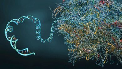 تقوم الريبوسومات، في الصورة، بتصنيع البروتينات عن طريق ترجمة الحمض النووي الريبوزي المرسال (mRNA) إلى…