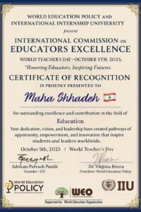 حصلت شحادة على الجائزة التي تمنحها كل من World Education Policy وInternational Internship University تقديرًا لإسهاماتها البارزة في تطوير التعليم وتمكين المعلمين والطلاب على حد سواء.